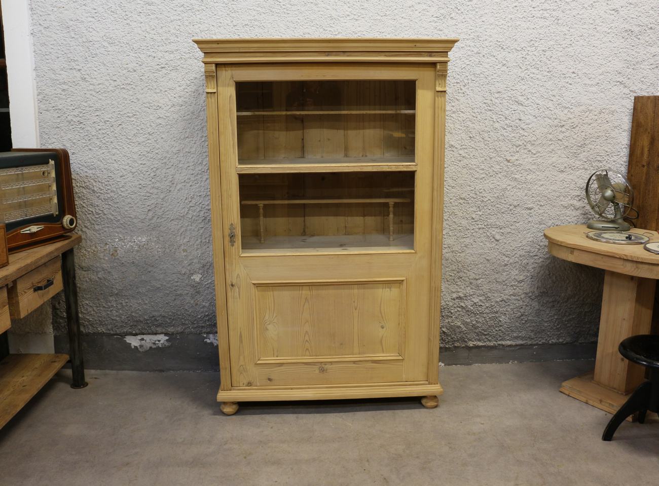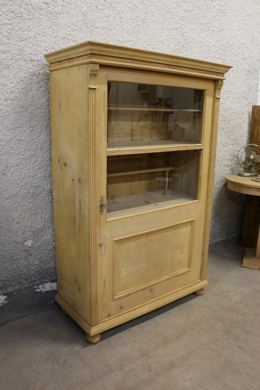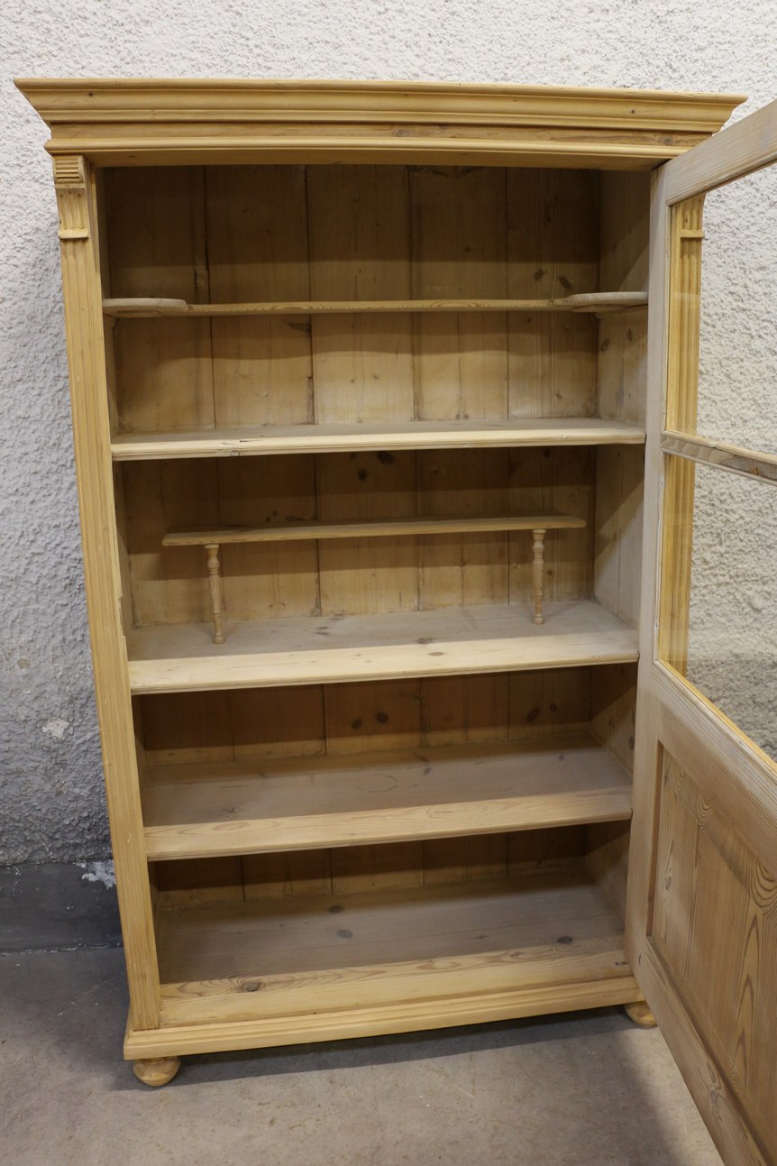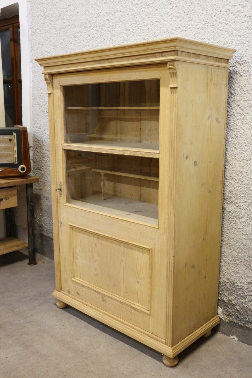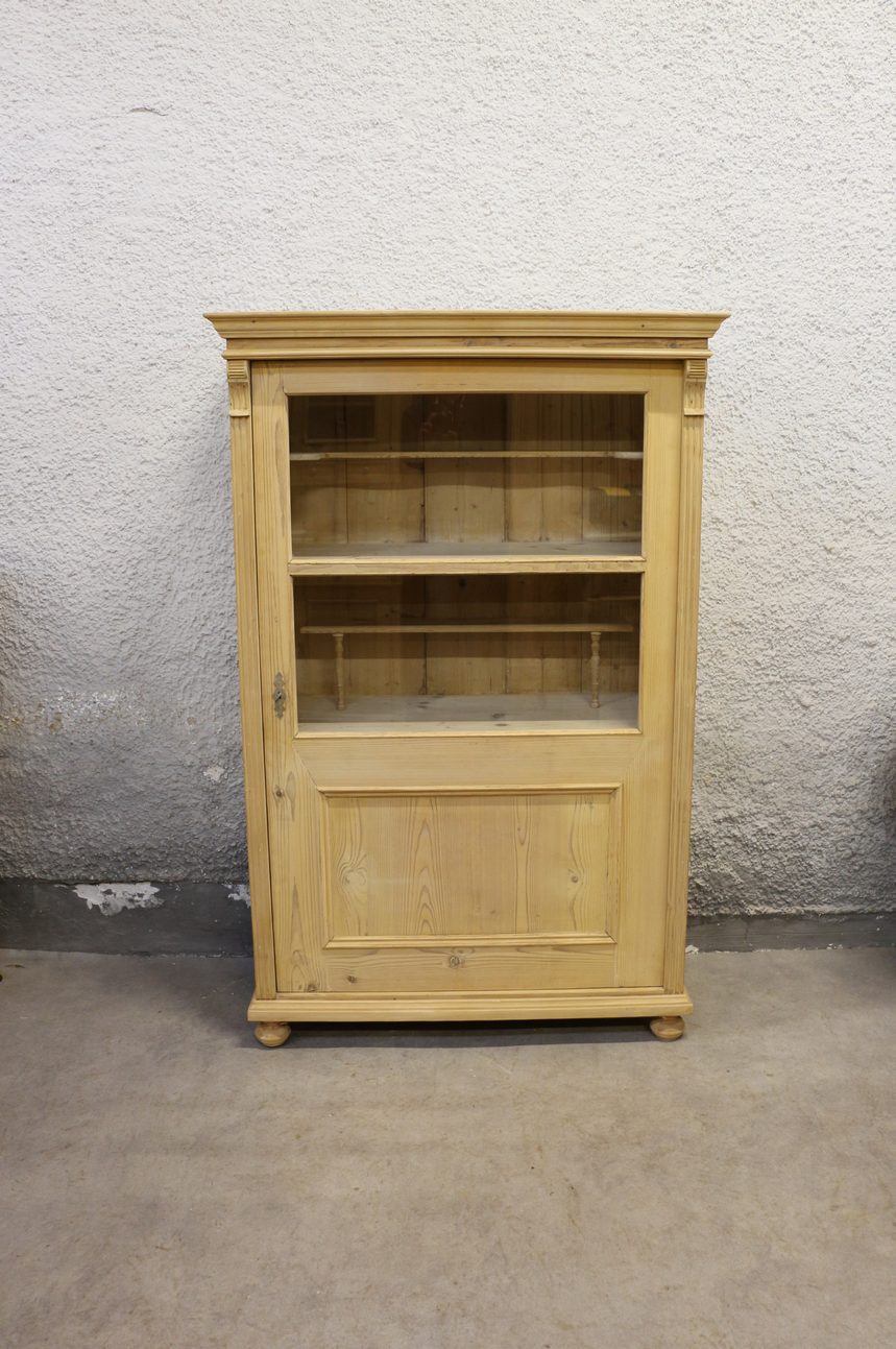Dieser sehr schöne Vitrinenschrank mit den Maßen 171 × 111 × 54 cm (Höhe × Breite × Tiefe) ist eine ideale Lösung zur Präsentation von Dekorationen oder Geschirr. Der Schrank wurde fachmännisch restauriert, wobei die Oberfläche bewusst nicht gewachst wurde, um die natürliche Holzstruktur und Optik zu erhalten. Die geräumigen Regalböden bieten ausreichend Platz zur ordentlichen Aufbewahrung Ihrer Lieblingsgegenstände. Dieses Möbelstück ist perfekt für ländliche Wohnräume oder Ferienhäuser geeignet.