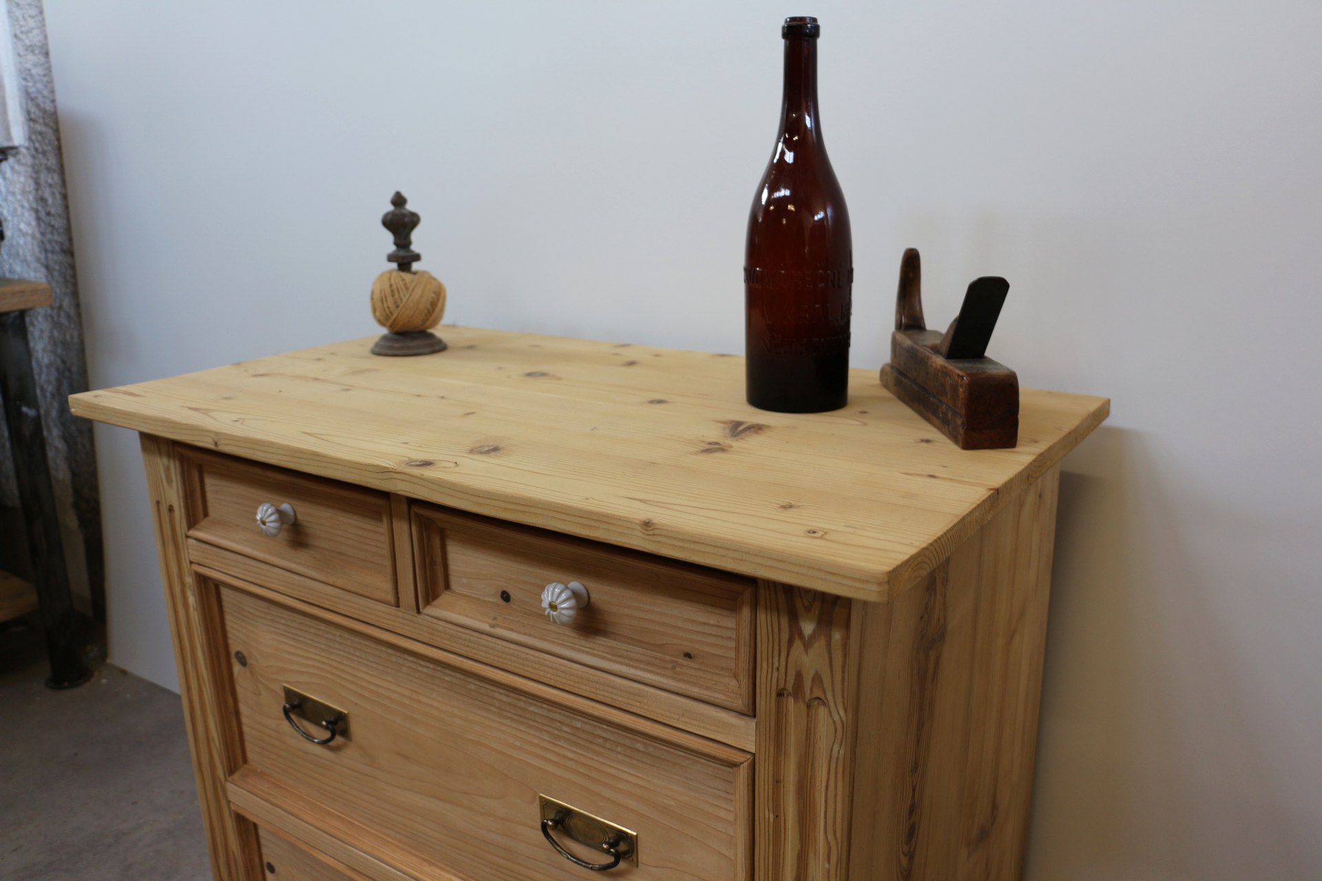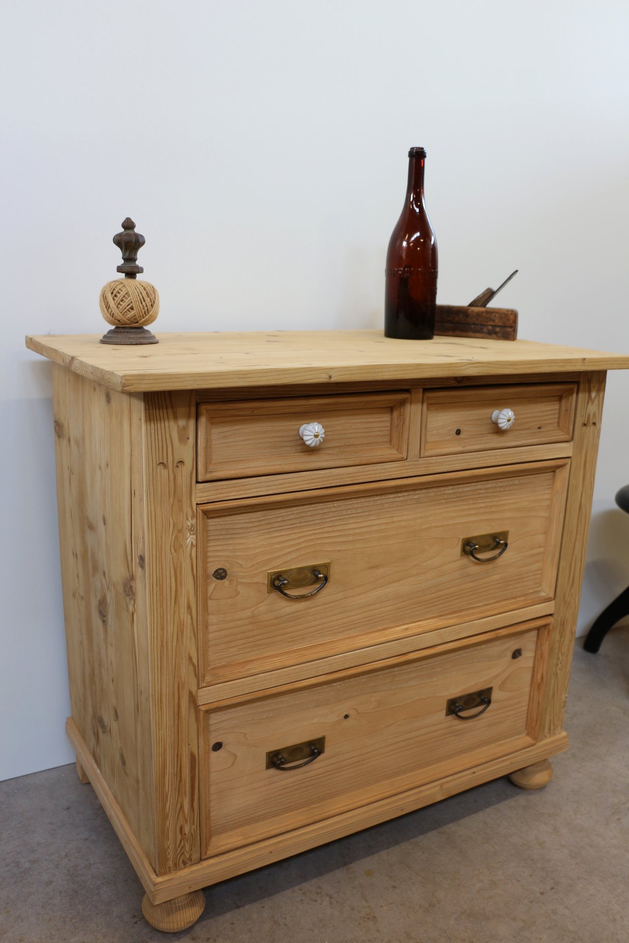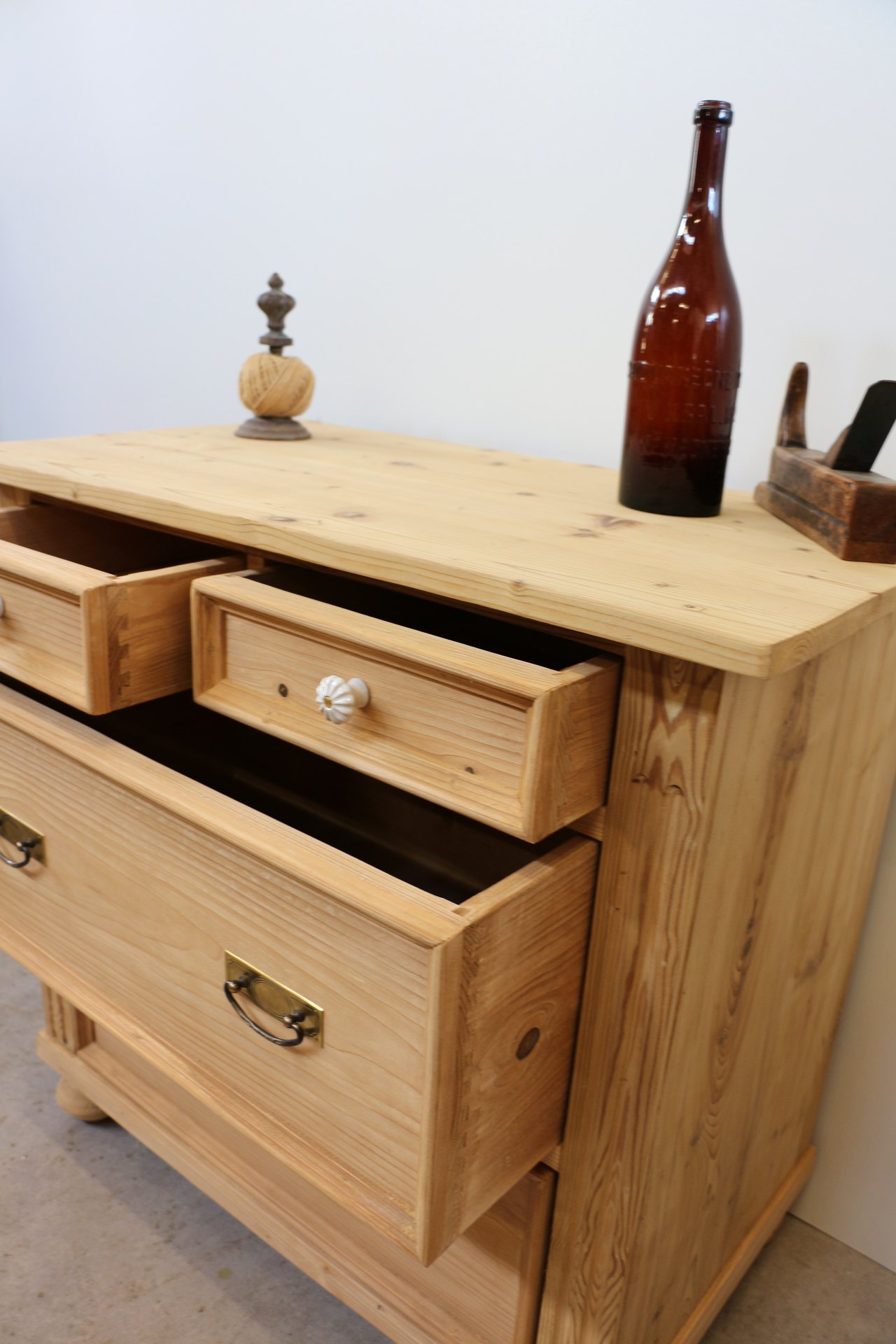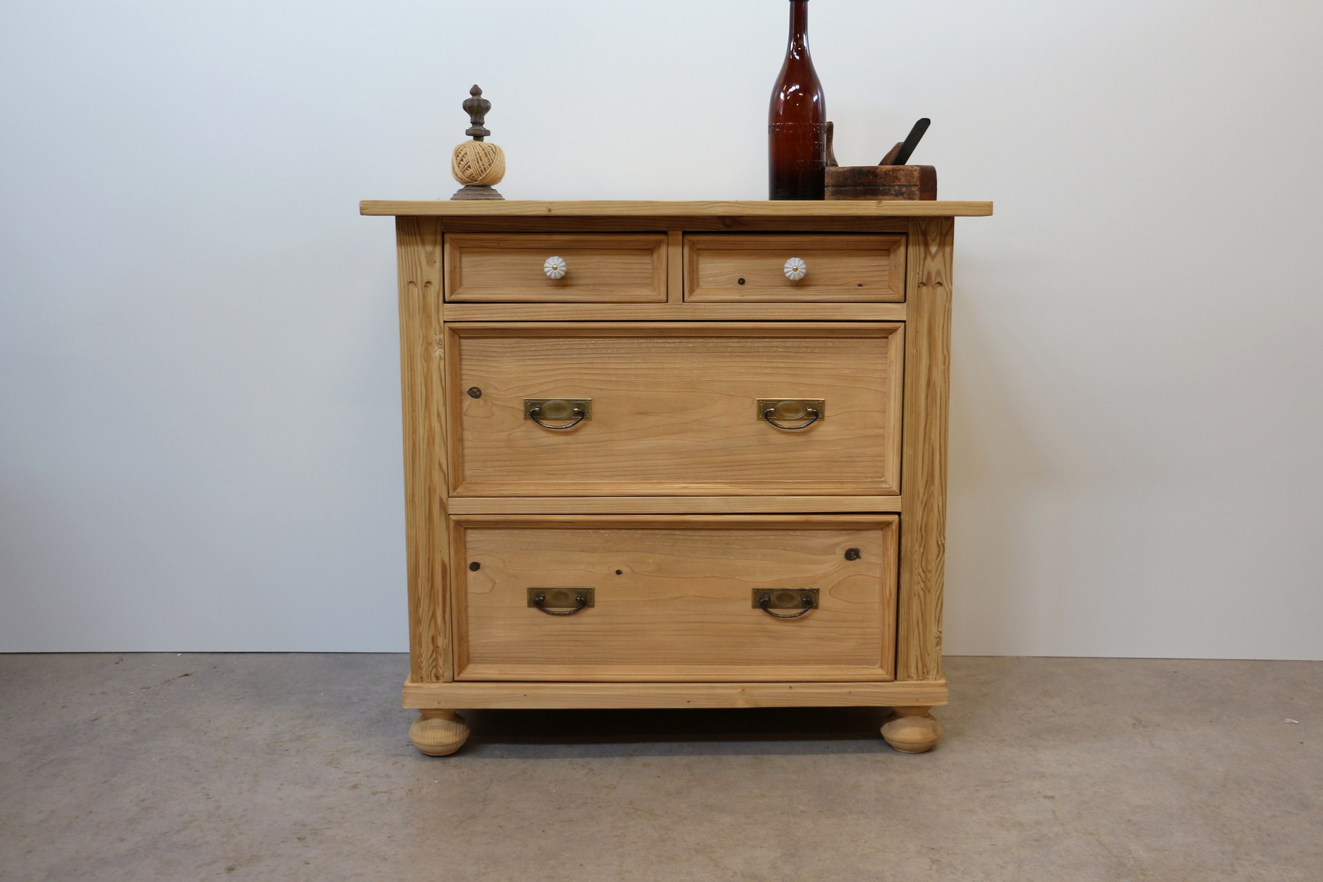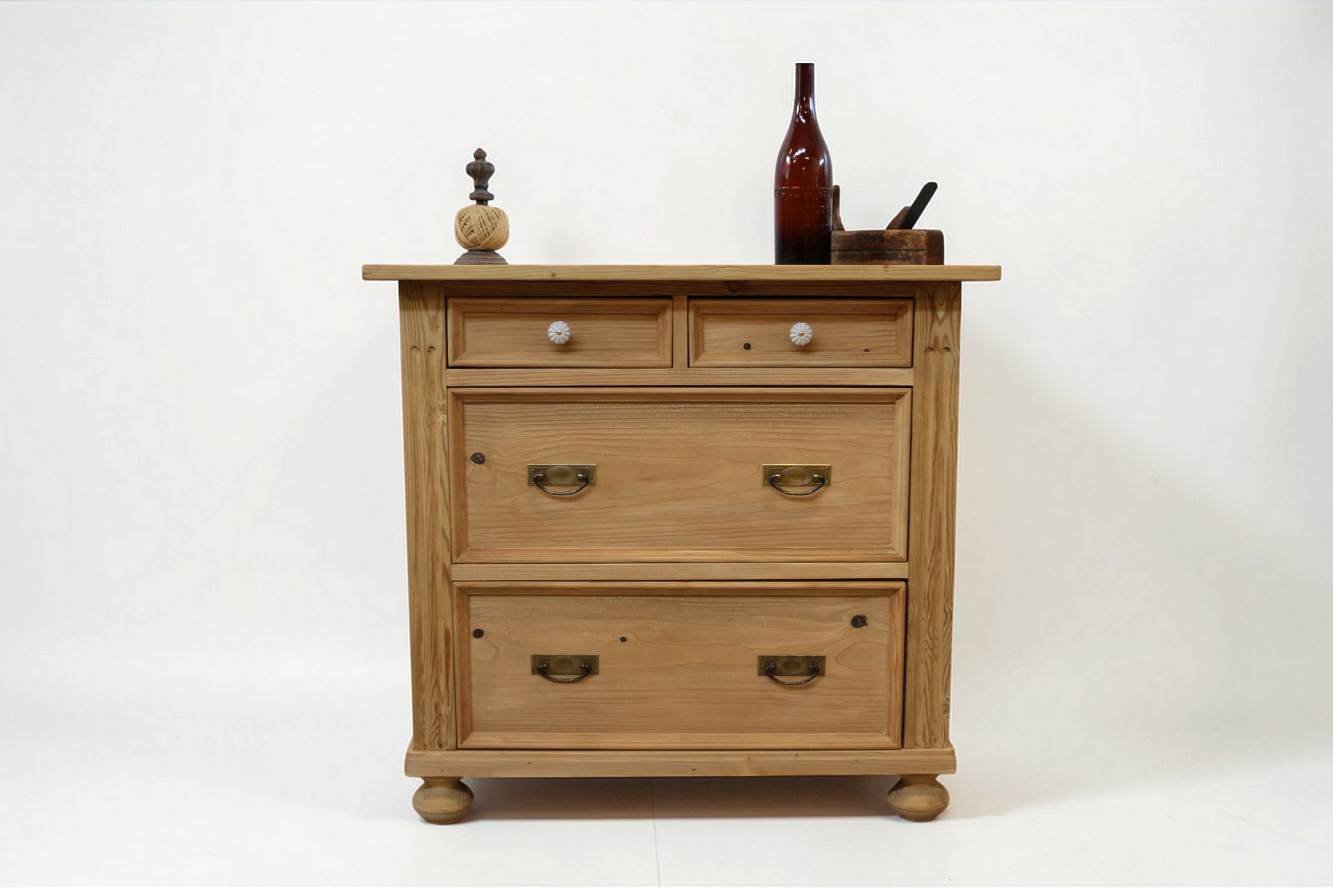 Die Kombination aus stilvollen Altmessing-Beschlägen und Porzellanknöpfen bei den kleinen Schubladen unterstreicht den authentischen Charakter im Bauernmöbel-Stil.